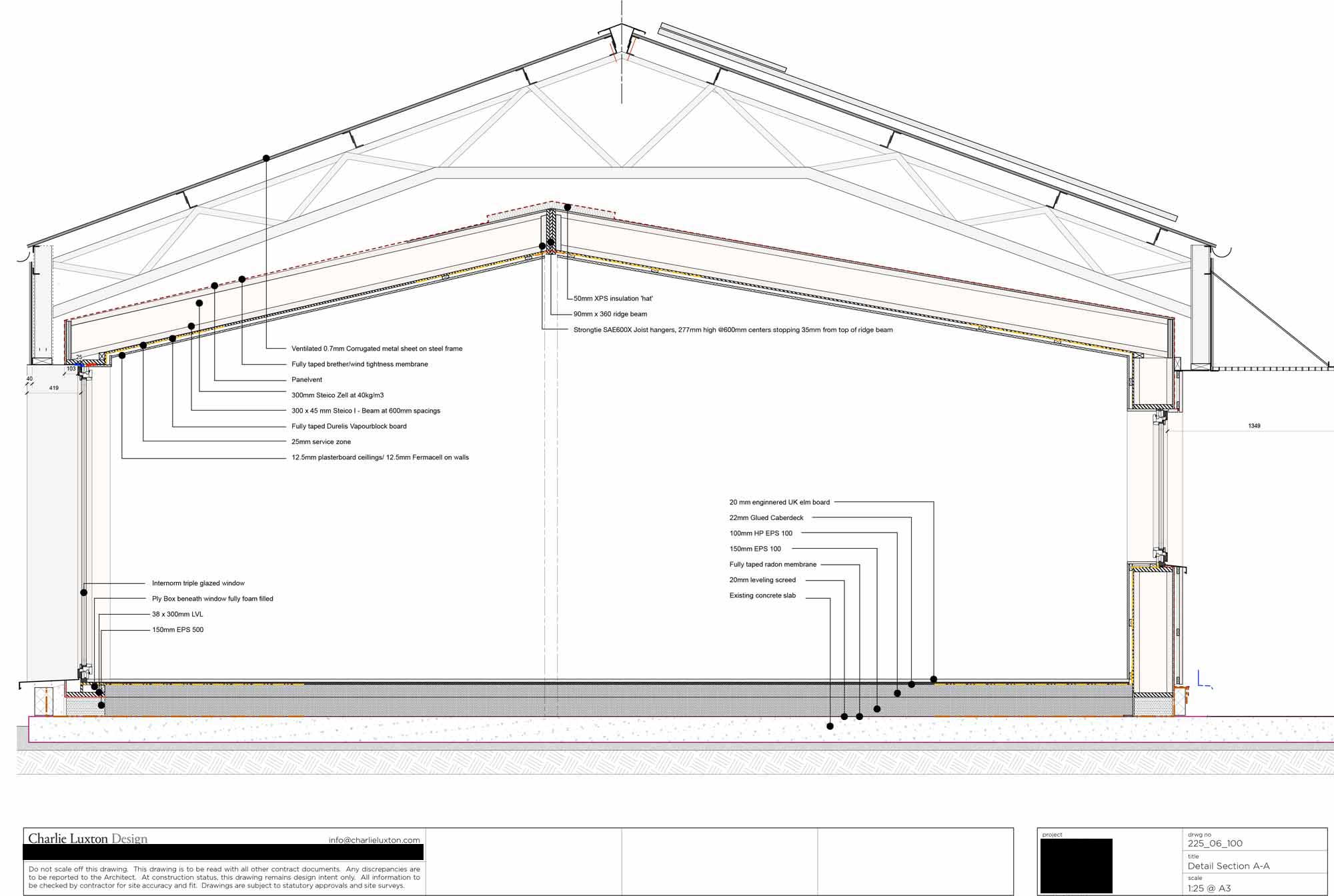 Roof: Polyester powder coated corrugated iron sheet on steel frame, followed underneath by wind-tight membrane, Panvelvent breathable sheathing board, Steico I-beam system with 300 mm Steico Zell wood fibre insulation, Durelis Vapourblock airtight vapour control board, 25 mm services zone, 12.5 mm