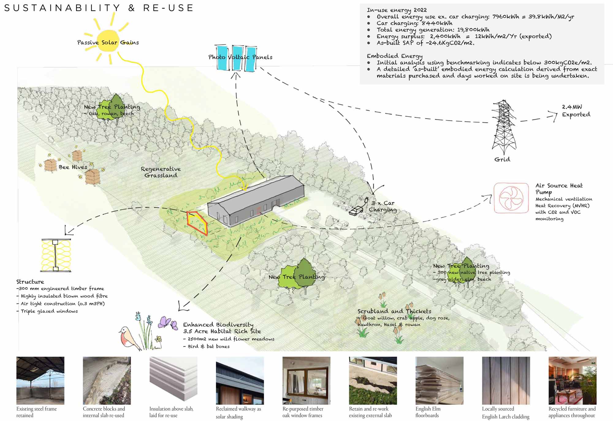 Sustainable materials: Steico PEFC certified timber building system, steel barn and concrete slab retained, salvaged oak door reused as internal screen, salvaged timber from horse stables used for internal finish, walkways recycled as solar shading, rubber crumb reused locally, concrete blockwork and site hardcore reused. Floor insulation, cladding and roofing are designed to be easy to remove and reuse in future. English larch cladding, English elm floorboards. Recycled furniture and secondhand appliances throughout.