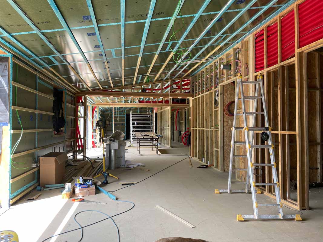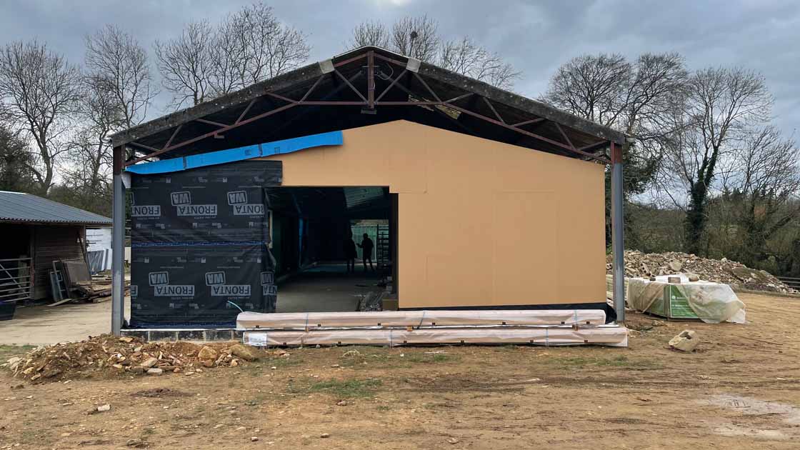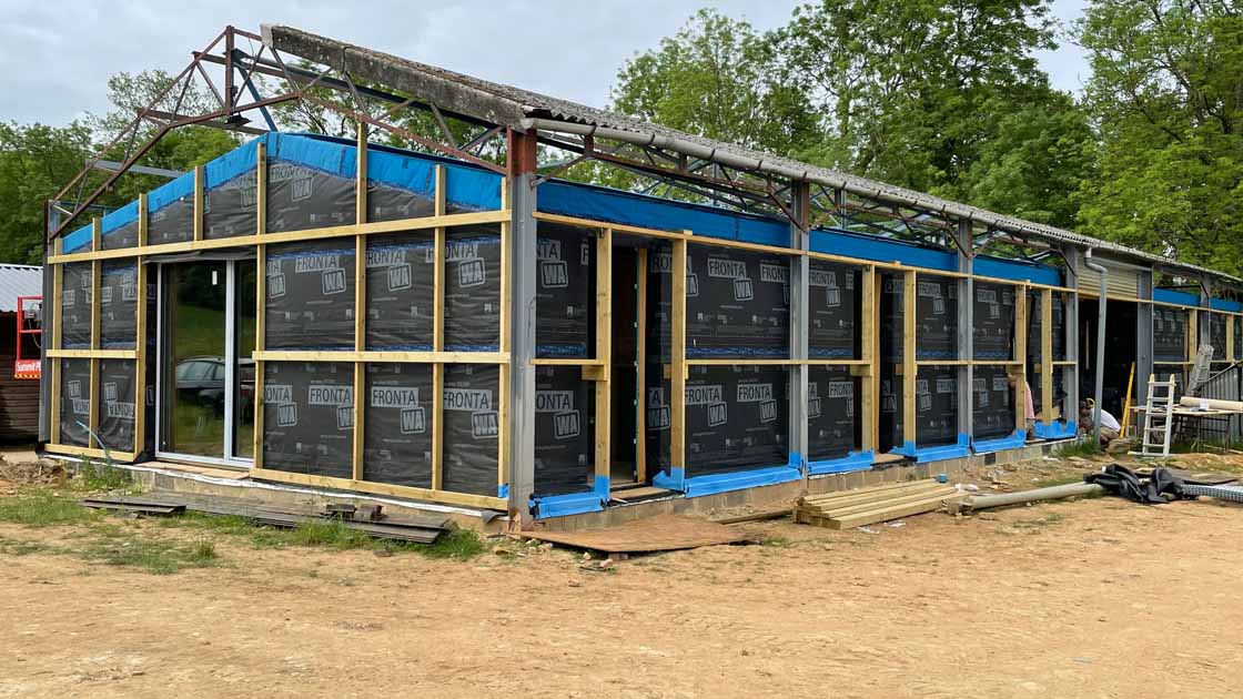 Battened and counterbattened wall awaiting the powder coated corrugated iron cladding and roofing.
