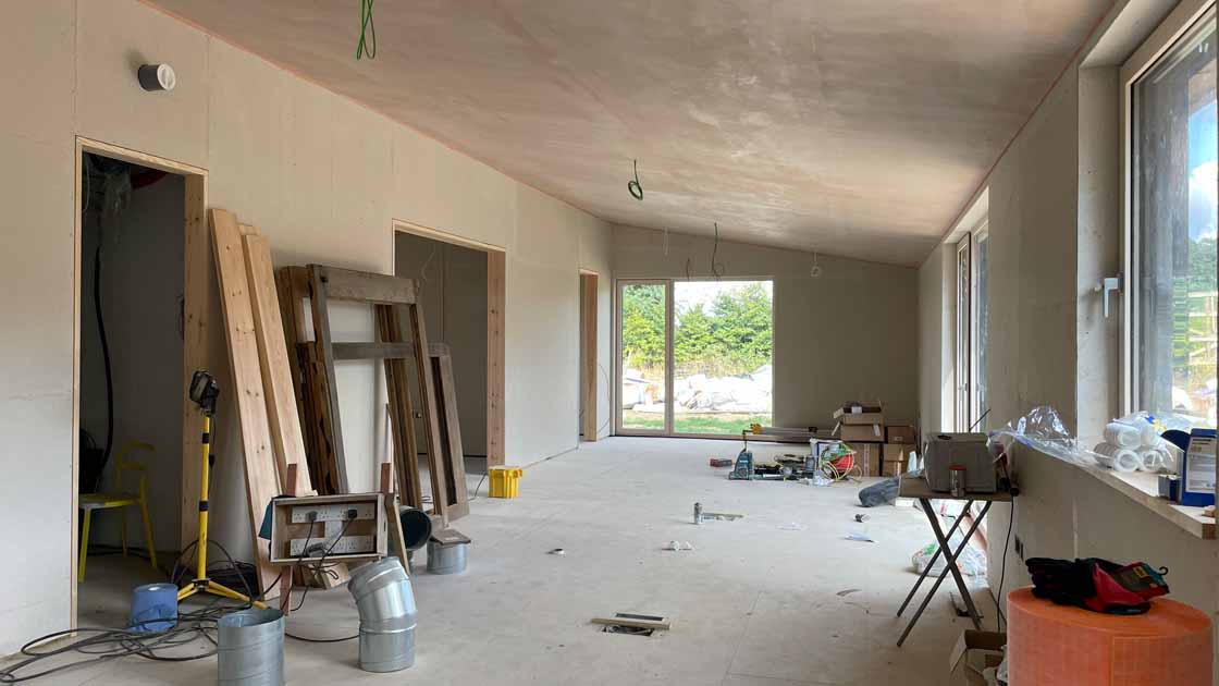 Steico laminated veneer lumber (LVL) — a mass timber product that takes dozens of thin layers of wood and glues them together to create a structural timber panel — was used for posts and beams, and around the building’s Internorm timber aluclad triple glazed windows. Durelis VapourBlock, a structural chipboard that also provides airtightness and vapour control, frames the walls and roof internally, and serves as the main airtightness layer too. The walls and roof were pumped with blown cellulose insulation (Charlie brought his local labourers down to PYC Systems in Welshpool for training in how to install it), and then lined internally with Fermacell board, which is made from recycled gypsum and paper.