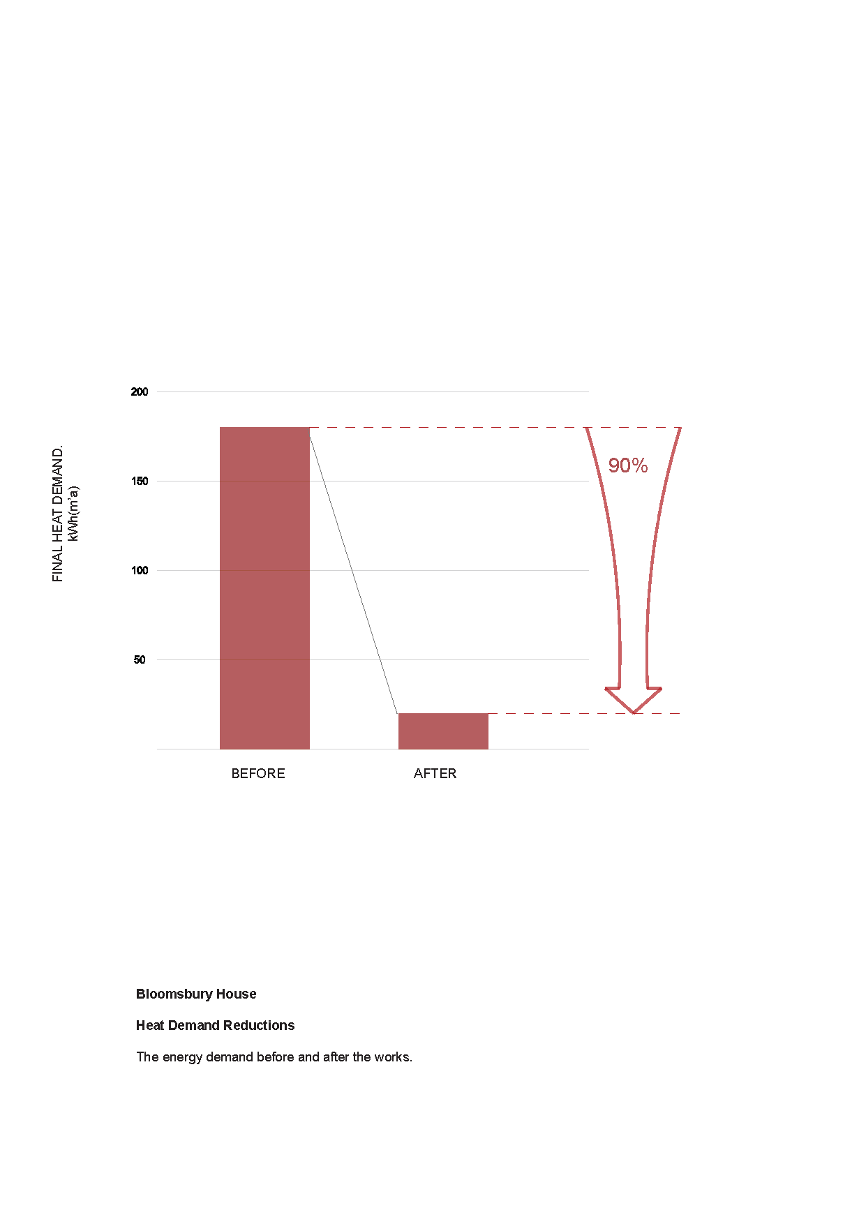 Calculating the energy performance before and after the retrofit suggests that while the heat demand of the unimproved fabric would have been around 180 kWh/m2/yr, retrofit will have slashed this by nearly 90% to 20 kWh/m2/yr.