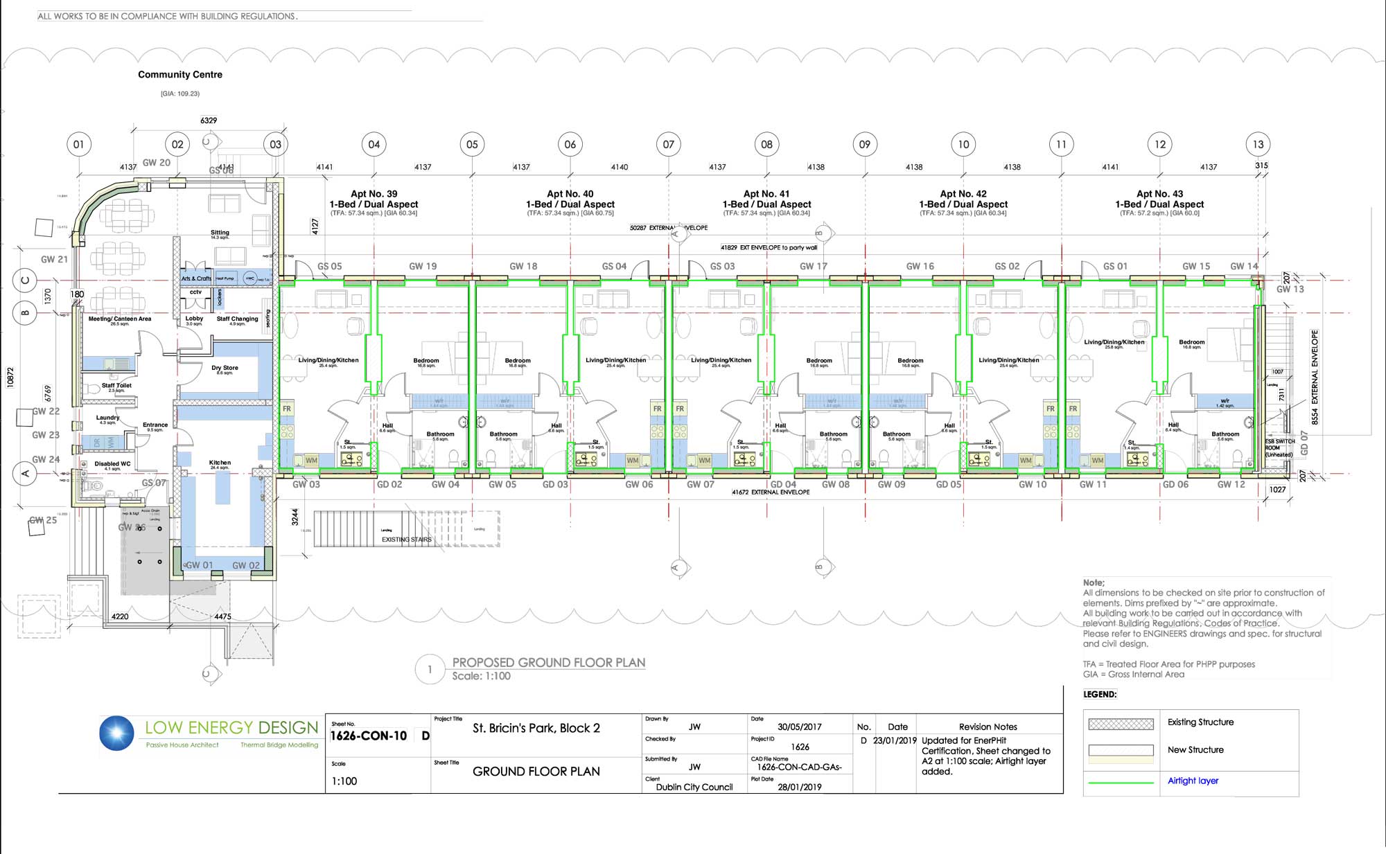 Building type: 22 x 1960s bedsits (approx. 26 sqm each) turned into 11 one-bedroom (approx 60 sqm each) apartments & a community centre. Concrete block/brick structure with pitched roof & concrete tiles.