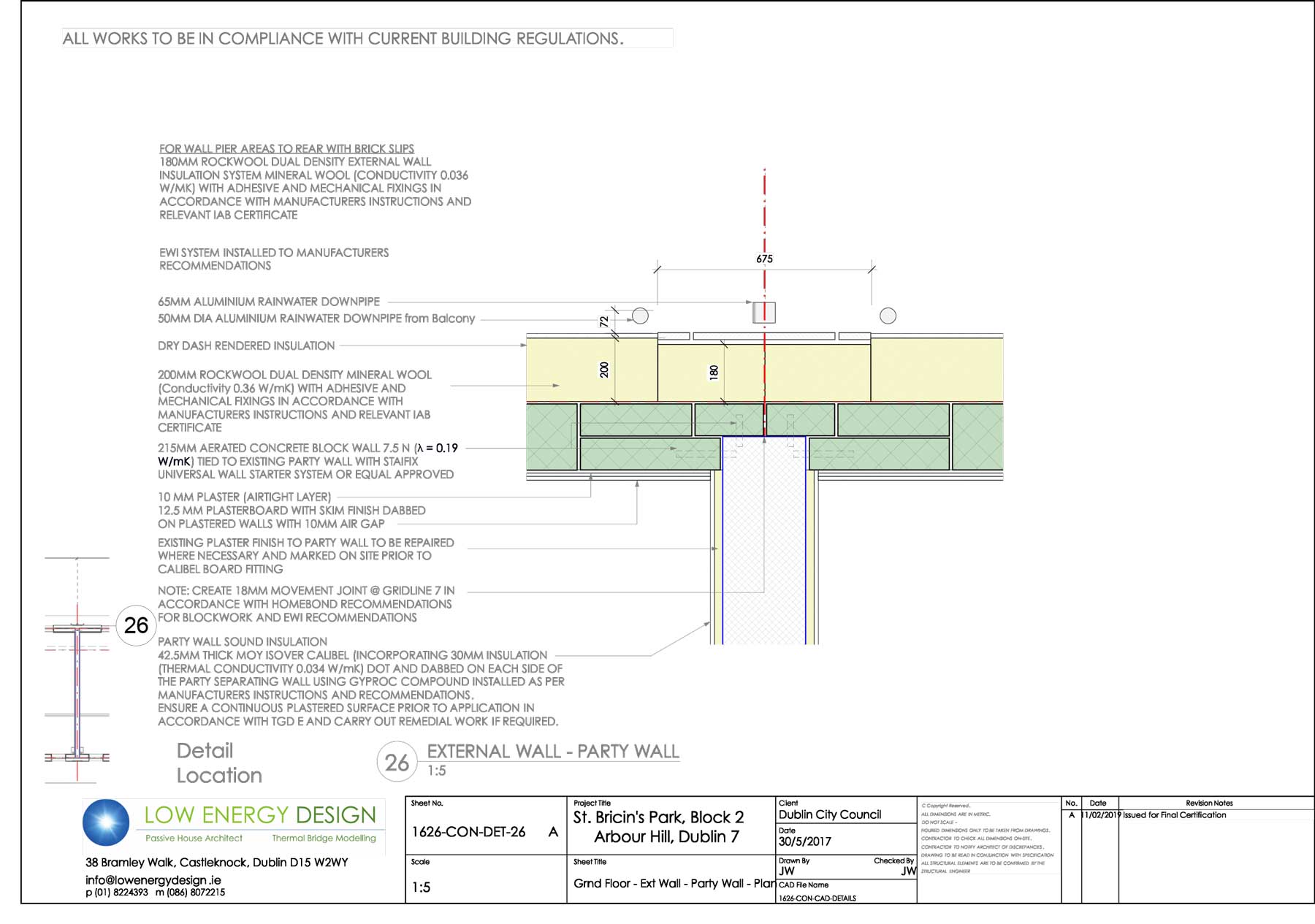 After, front & rear walls: 12.5mm plasterboard on 15mm dabs internally, followed outside by plastered 215mm Quinnlite B7 Blockwork, externally insulated using Baumit external wall insulation system comprising 200mm Rockwool dual density slab and dry dash finish; some sections with 180mm Rockwool dual density slab and 20mm Ibstock brick slip finish. U-values: 0.14-0.15 W/m2K