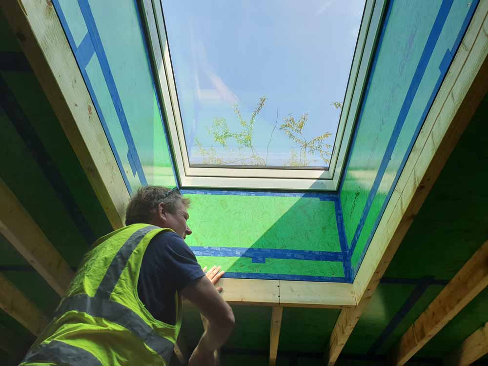 Airtight membrane taped around original roof trusses in loft space housing MVHR