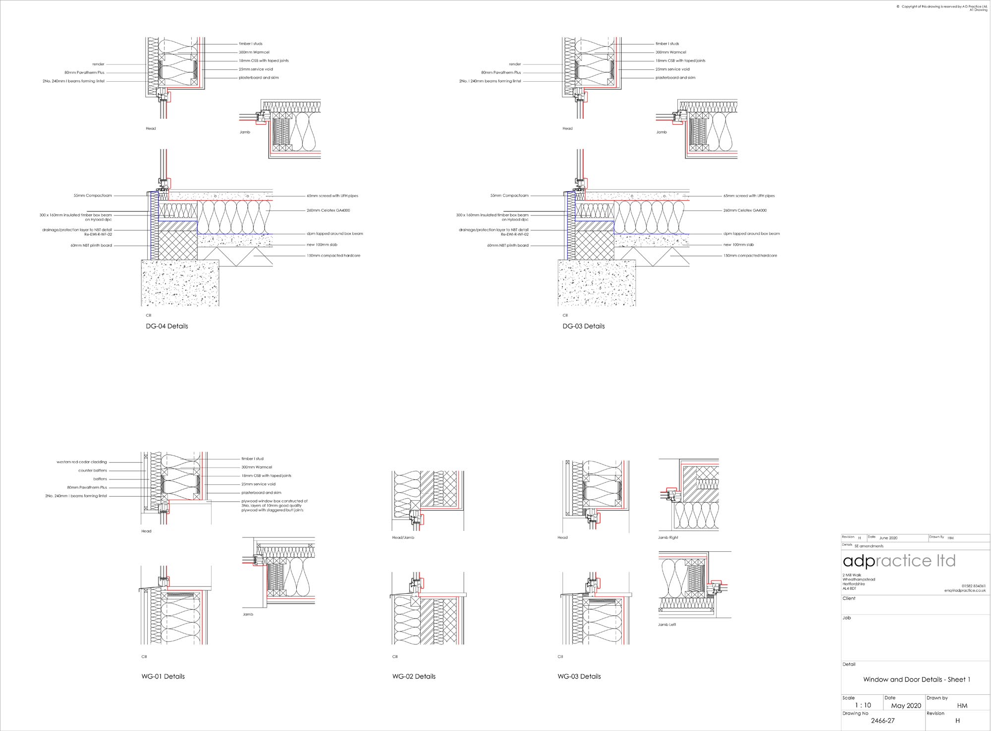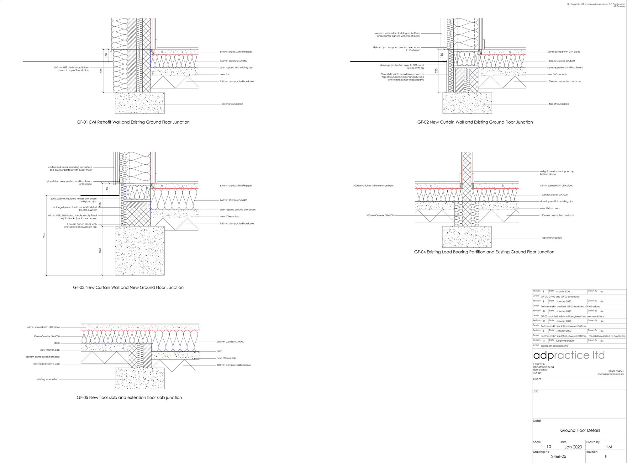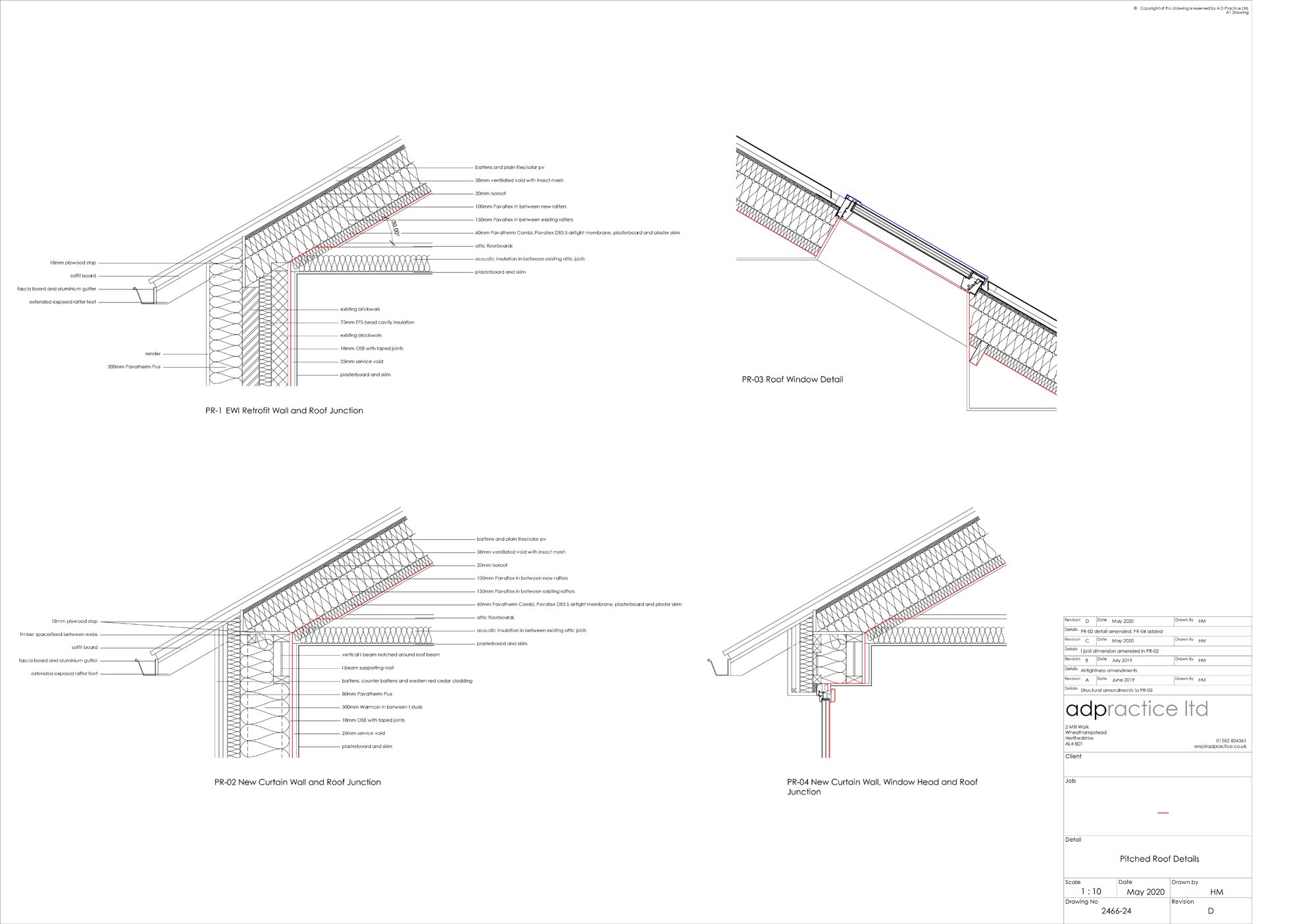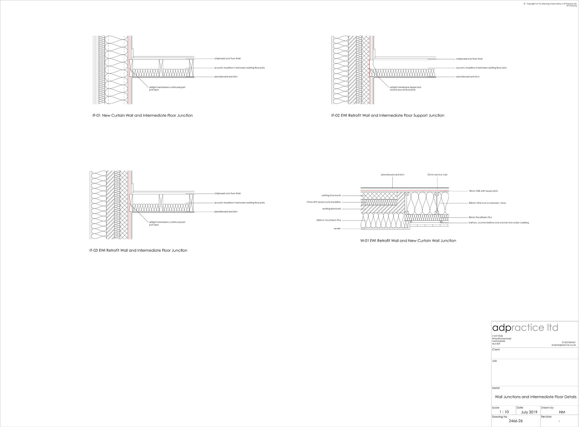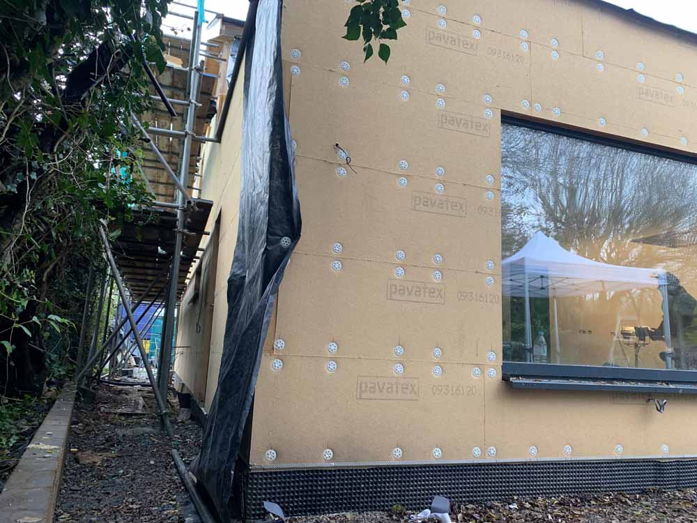 After: Render/timber cladding on 200 mm Pavatex Isolair woodfibre insulation (thermal conductivity 0.041 W/mK), existing full filled cavity wall, Smartply Propassiv for airtight layer, 25 mm service void, plasterboard and skim. U-value: 0.129W/m2K Curtain walls/extension: Render/timber cladding on 80 mm Isolair (thermal conductivity 0.041 W/ mK), 300 mm I studs with Warmcel cellulose blown in between (thermal conductivity 0.038 W/mK), Smartply Propassiv for airtight layer, 25 mm service void, plasterboard and skim. U-value: 0.109 W/m2K Existing roof