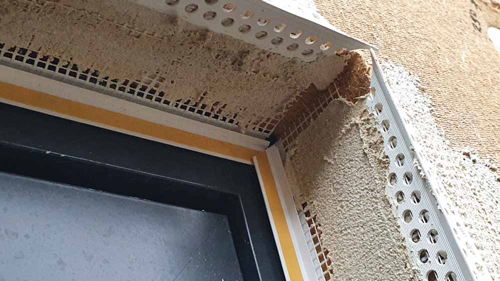 New window installed in existing cavity wall, protruding from brickwork to link into external insulation layer
