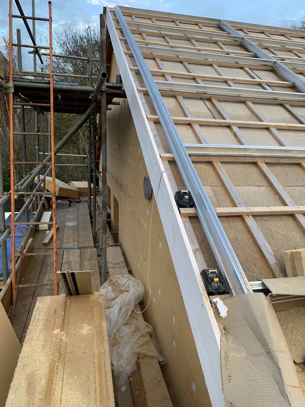 Woodfibre sheathing board installed over the insulated doubled-up rafters