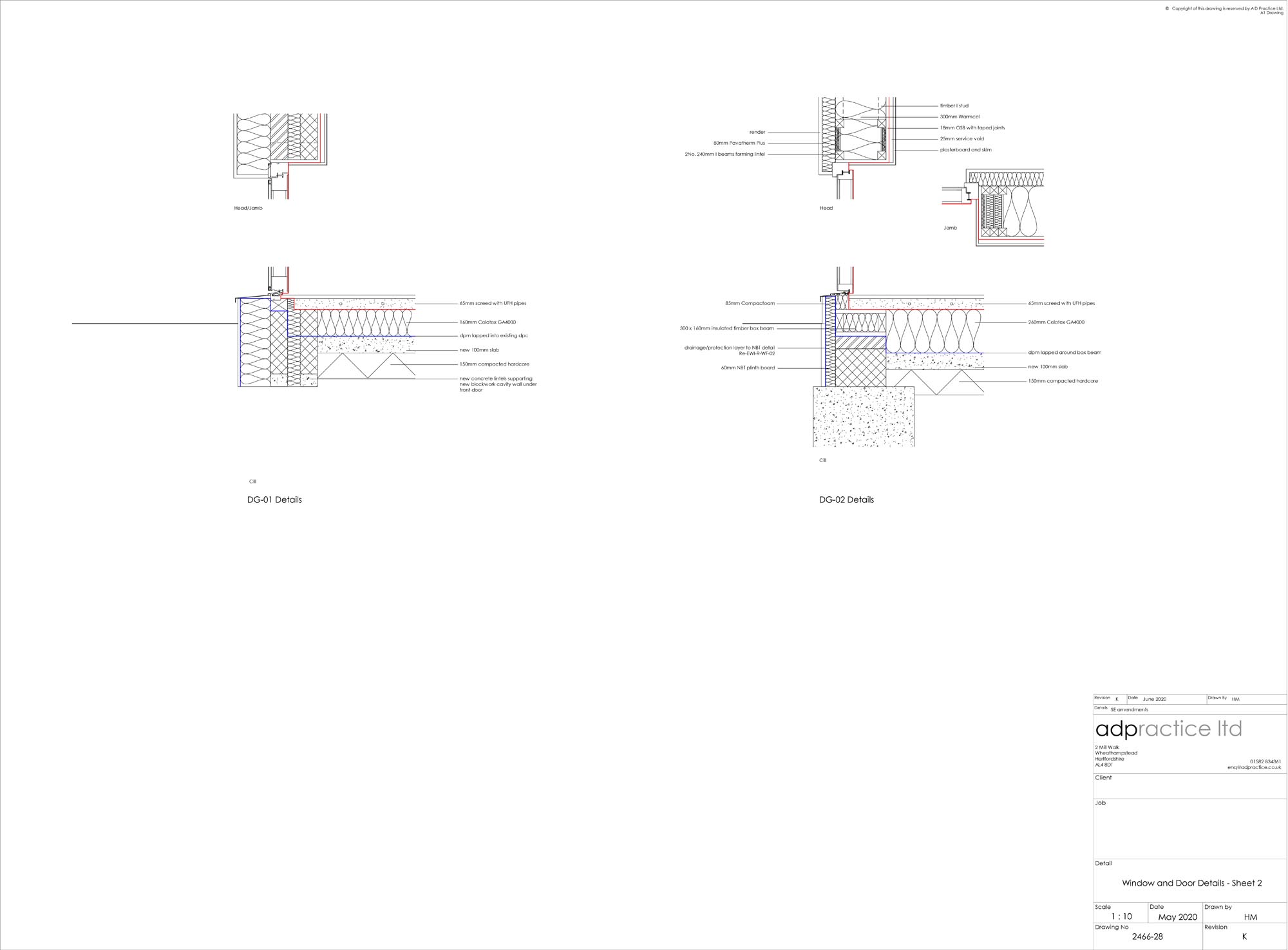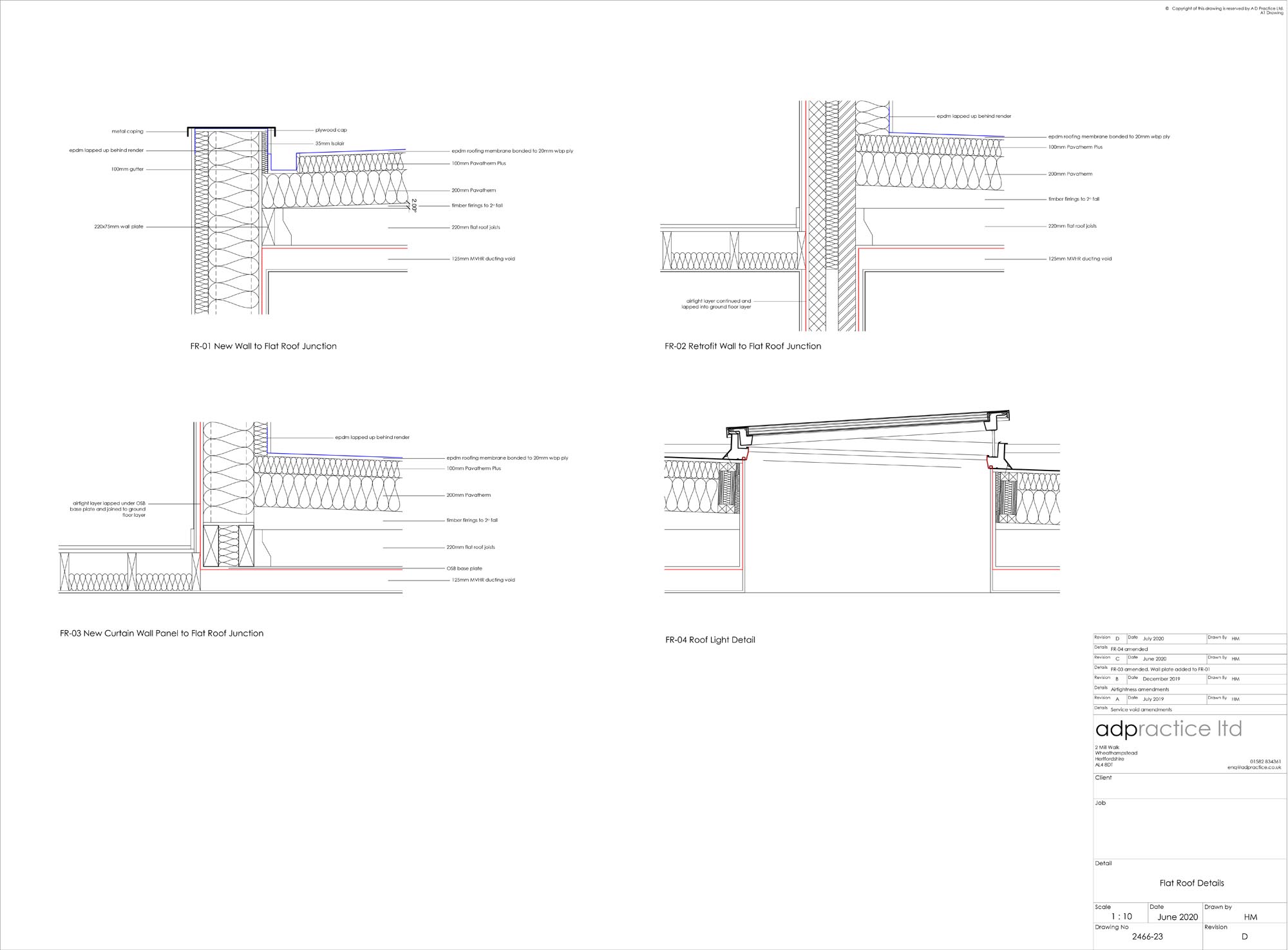 Flat roof: EPDM membrane on ply over 100 mm Isolair (thermal conductivity 0.041 W/mK), 200 mm Pavatherm (thermal conductivity 0.038 W/mK), 220 mm timber joist, Smartply for airtightness, service void, plasterboard and skim. U- value: 0.103W/m2K