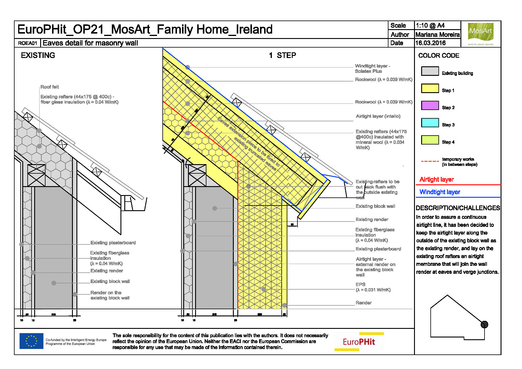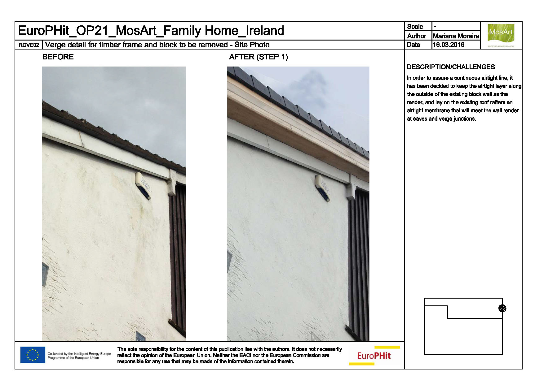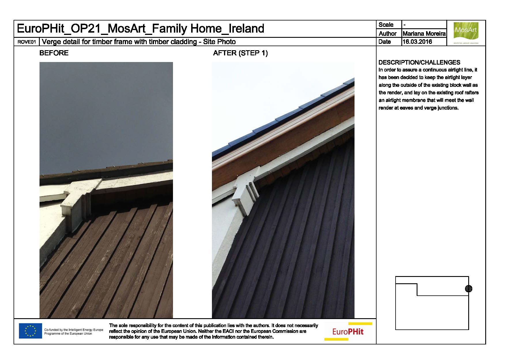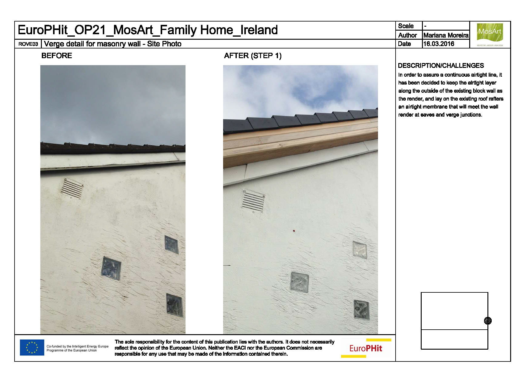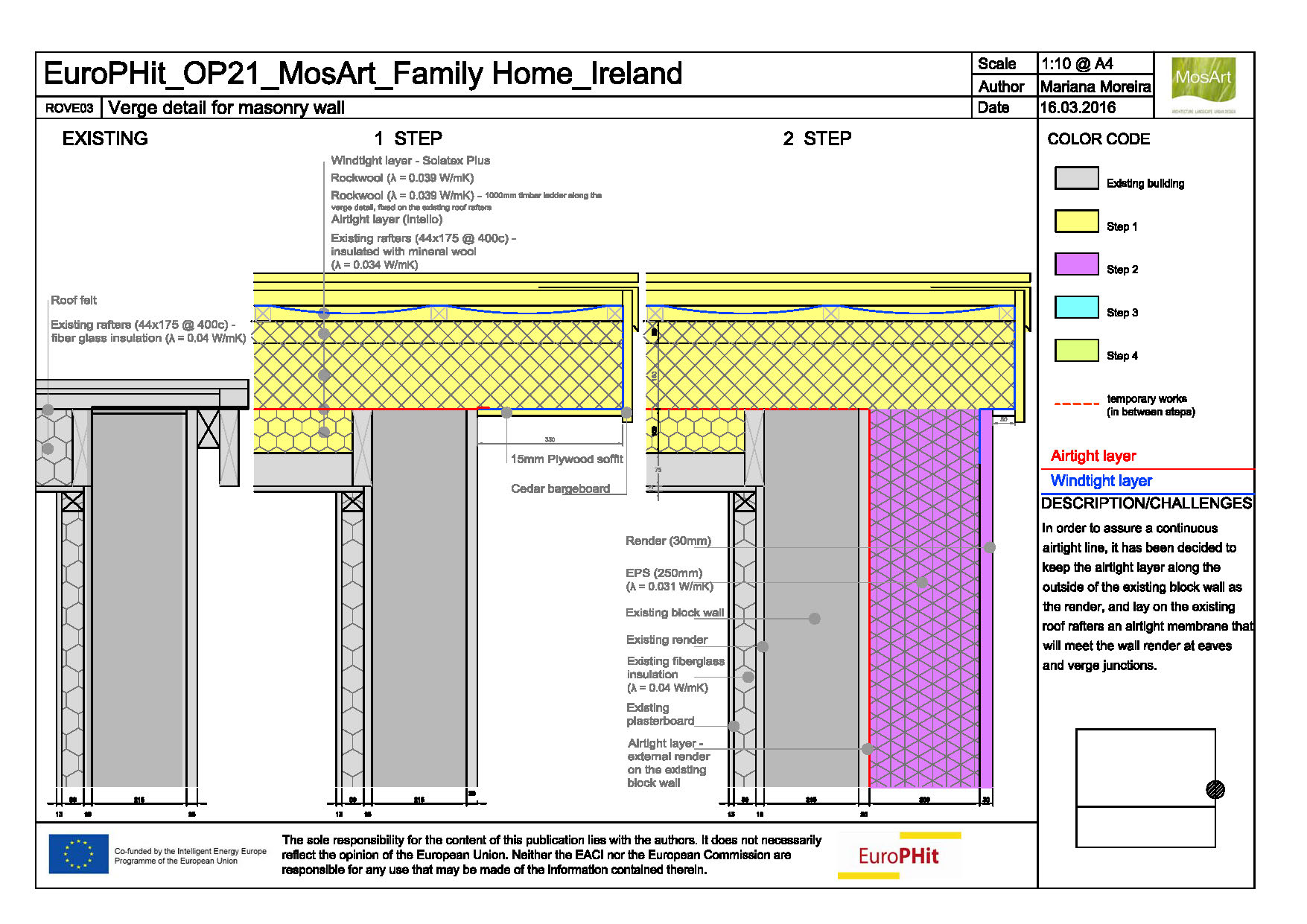Roof insulated on the slope: Existing 175mm timber rafters (44mm at 400 centres) insulated with fibreglass. Sealed 22 mm air gap between plasterboard and timber rafters. U-value: 0.250 W/m2K After: Roof insulation only on the slope (warm attic now part of the thermal envelope where the heat recovery ventilation is installed and first floor air ducting network is located). 100 mm mineral wool between existing 175 mm rafters (44mm at 400 centres), Pro Clima Intello airtight membrane above existing rafters, 150mm + 50 mm Rockwool insulation outside existing rafters and airtight membrane, Pro Clima Solitex Plus membrane over Rockwool insulation. U-value: 0.125 W/m2K