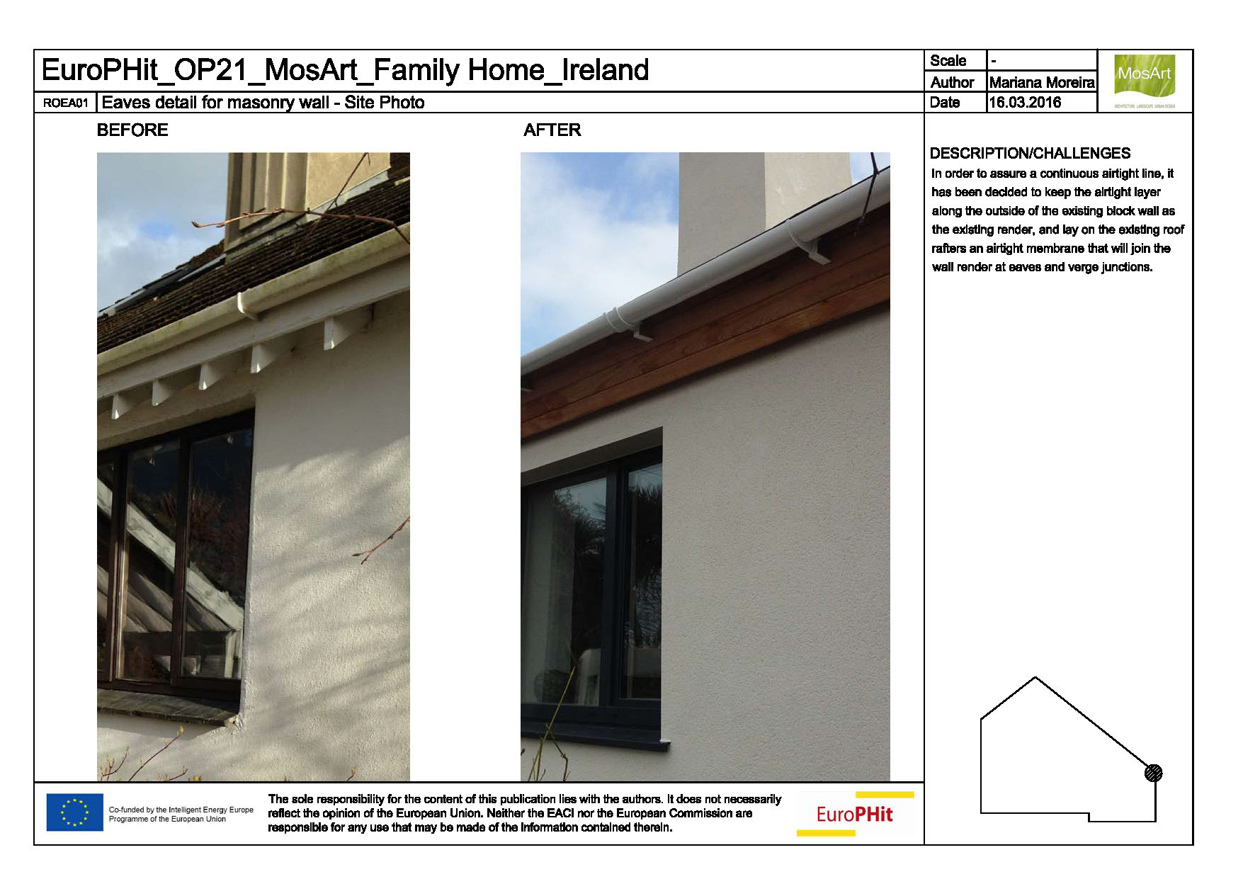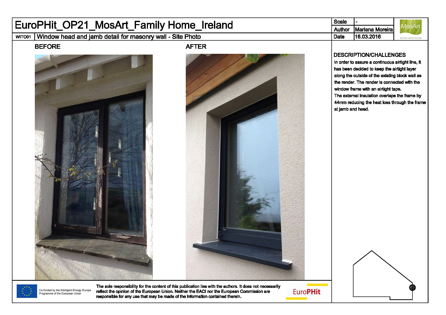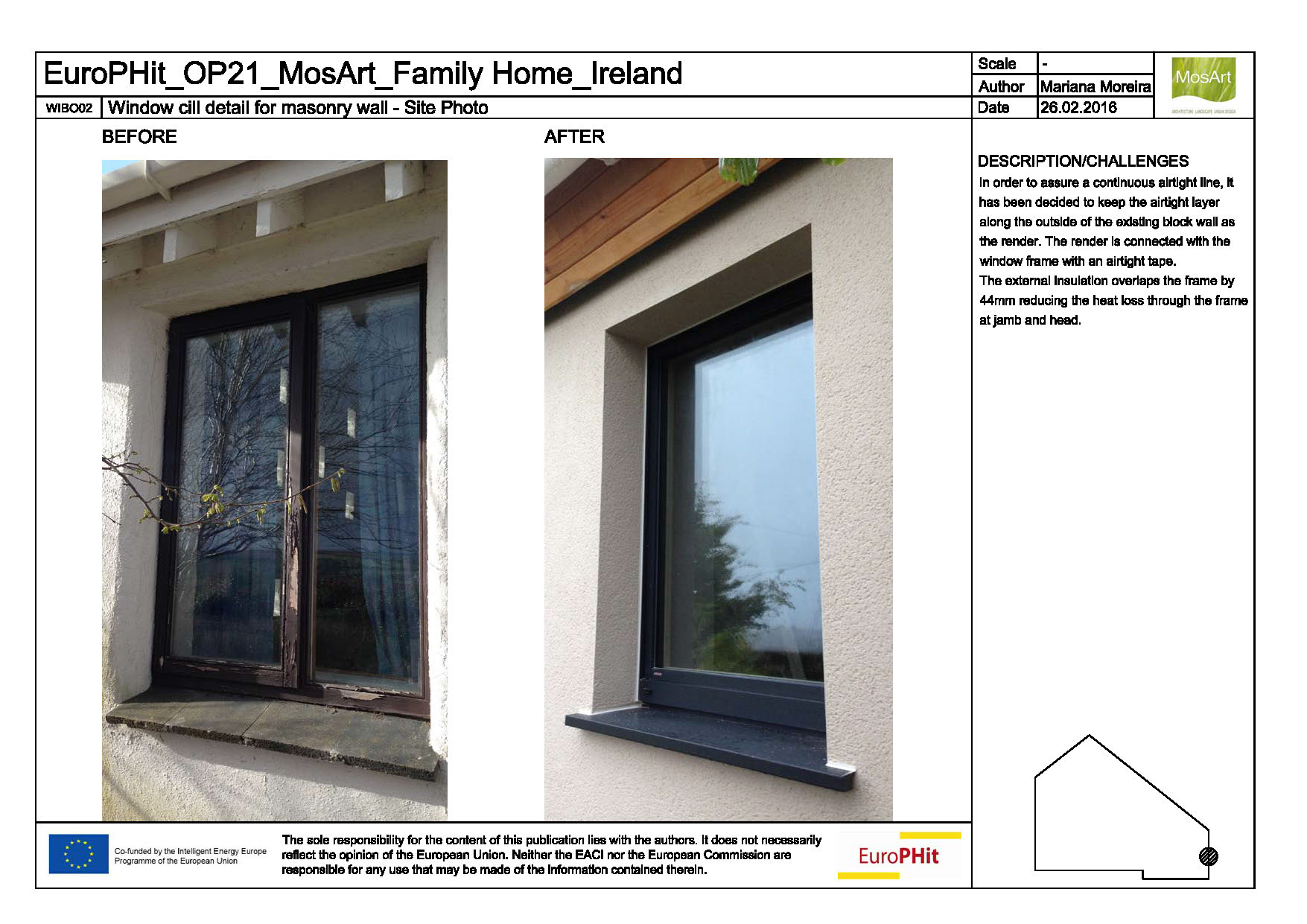 After (north facade): 250mm Platinum EPS insulation and silica render finish externally fixed on existing 215mm rendered concrete block walls, internally insulated with 50 mm fibreglass. U-value: 0.106 W/m2K
